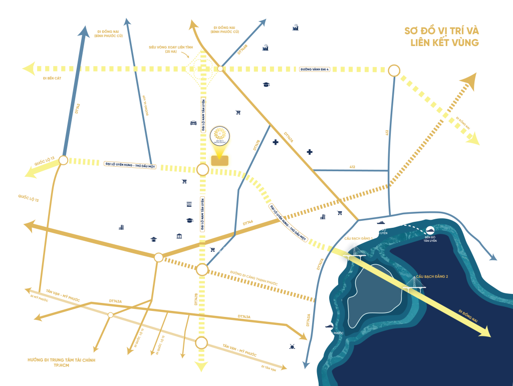 Khu nhà ở Hướng Dương tọa lạc tại phường Tân Hiệp, TP.HCM – vị trí tâm điểm vừa được sáp nhập, mở ra dư địa phát triển đô thị vượt trội. Dự án nằm ngay mặt tiền quy hoạch nút giao giữa Đại lộ Nam Tân Uyên và Đại lộ Uyên Hưng – Thủ Dầu Một, hai tuyến giao thông chiến lược kết nối vùng kinh tế trọng điểm phía Nam